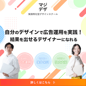 ![]() 公式サイト 相談予約 | 4.5 | 2万20円~ | 案件獲得サポート 独立支援 | 広告バナー運用 掲示板での質問可 受講生コミュニティ | 3ヶ月~ | 42万9,000円~ (2万20円~) | 受講中に制作した デザインを運用できる | オンライン | ||