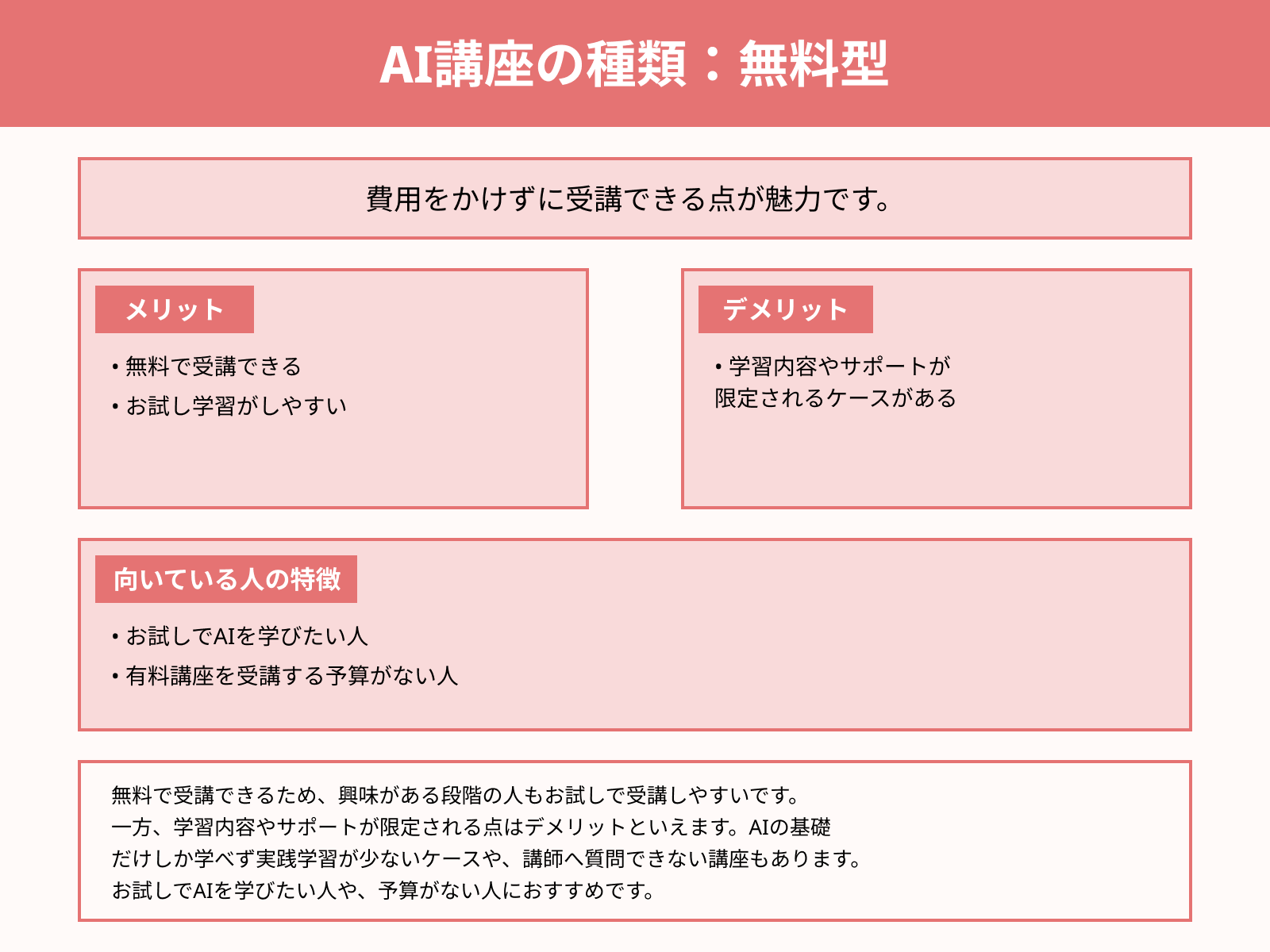 | 無料型講座のメリット | 費用がかからない |