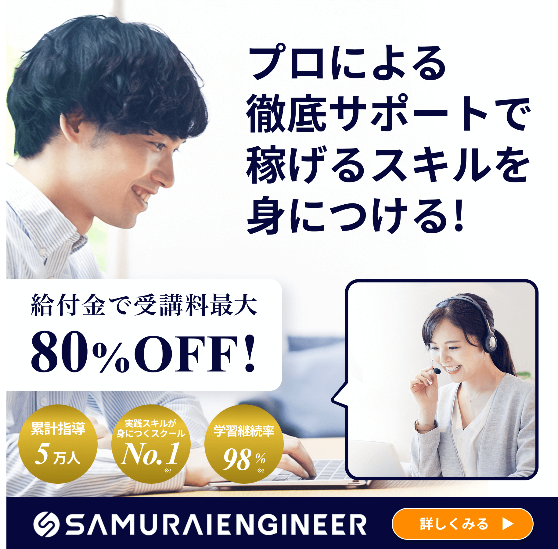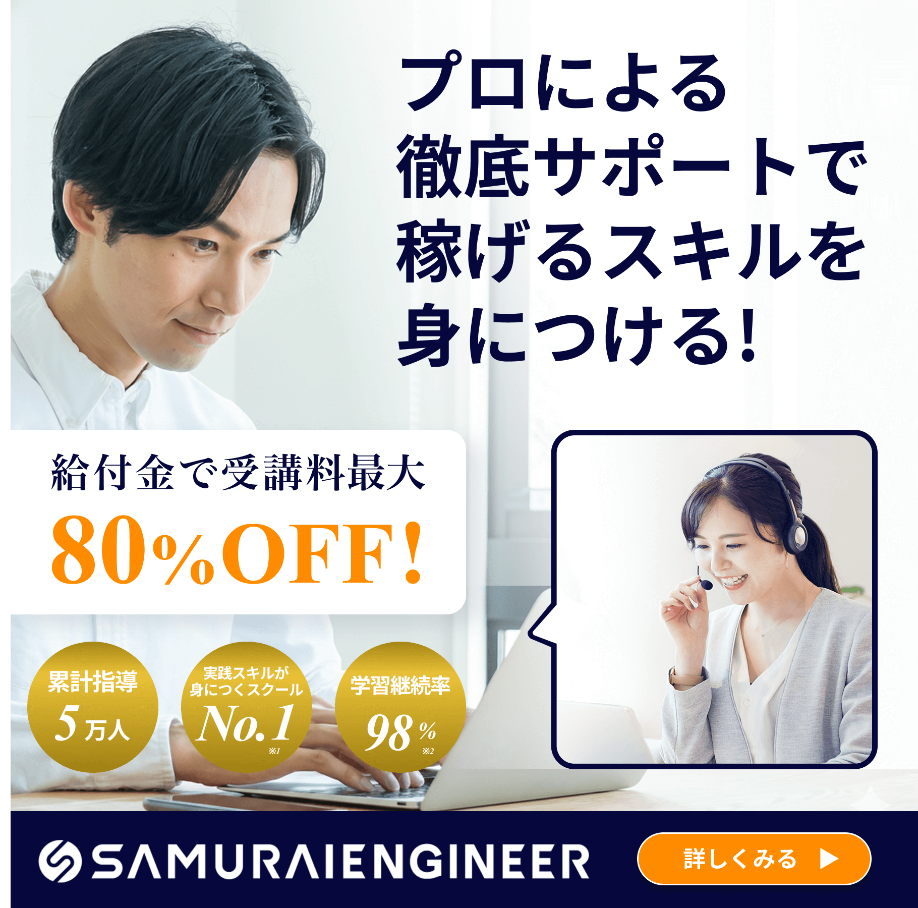 本記事はプログラミングやWebデザインなど、100種類以上の教材を制作・提供する「侍テラコヤ」、4万5,000名以上の累計指導実績を持つプログラミングスクール「侍エンジニア」を運営する株式会社SAMURAIが制作しています。
